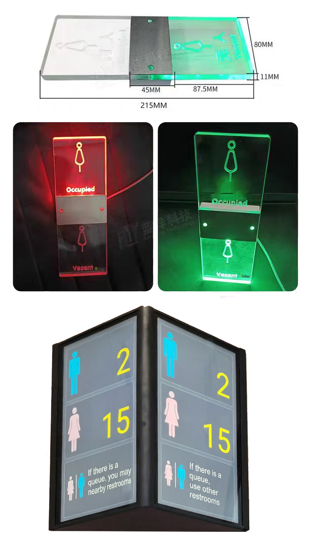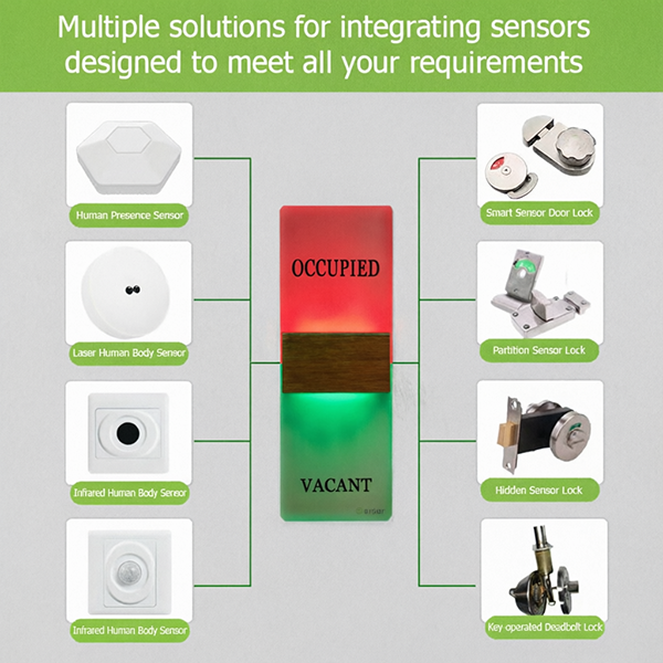 مستشعر الإشغال حل مثالي لضبط وتنظيم الازدحام أمام دورات المياه يتيح اكتشاف وجود شخص داخل الغرفة وإظهار الحالة على لوحة مضيئة خارجها، كما يمكن ربط النظام بشاشة عرض تُظهر عدد الغرف الشاغرة لكلٍ من الرجال والنساء.