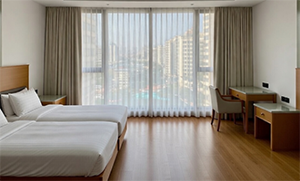 Every element, from lighting and curtains to service indicators and outlets, belongs to a single unified design family, ensuring the room feels harmonious and effortlessly comfortable.